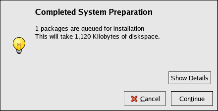 After selecting package groups and individual packages to install, click the Update button on the main window. Information such as the number of packages to be installed and the amount of disk space required to install the packages, as well as any package dependencies, is displayed in a summary window. If there are package dependencies, they are automatically added to the list of packages to install. Click the Show Details button to view the complete list of packages to be installed.
