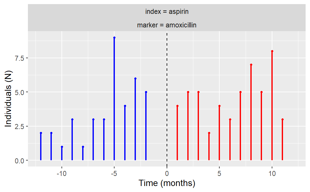 plotTemporalSymmetry(cdm = cdm, sequenceTable = "aspirin_amoxicillin")