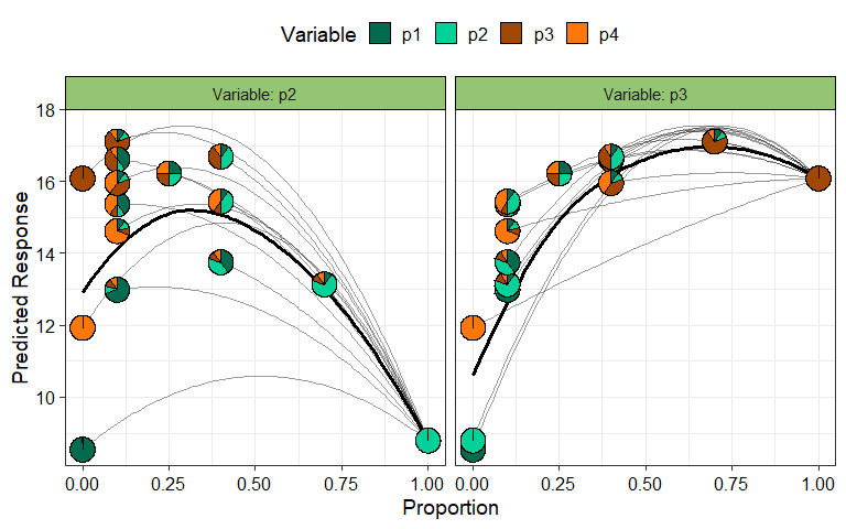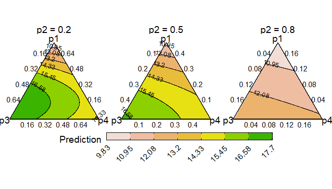 Ternary diagrams are a great tool for visualising the change in a continuous response, however they can only be created for examples with three compositional variables. If we have more than three compositional variables we create conditional ternary diagrams where fix n-3 compositional variables to have specific values and visualise the change in the predicted response across the remaining three variables as a contour plot in a ternary diagram.