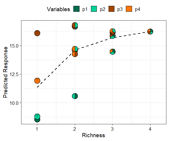 Next we show a scatterplot of the predicted response across all equi-proportional mixtures at each level of richness (number of species in a community). The points are replaced with pie-glyphs to show the proportions of the different species while the dashed black line shows the average change in response over the richness gradient.