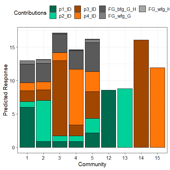 The coloured bars show the contributions of the different terms in the model. The contribution is defined as the product of the coefficient and value for each predictor variable. Thus, the contribution for a term would be zero if it’s value in an observation is zero regardless of it’s coefficient value (e.g. prediction bars for the monocultures at the right of the graph).