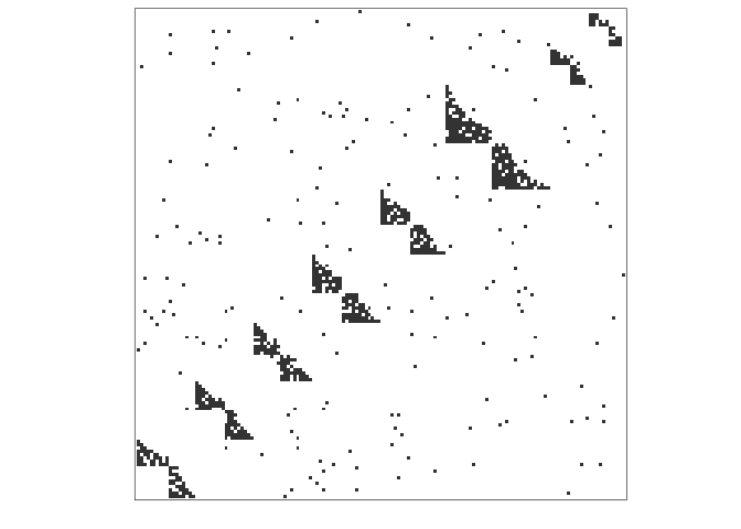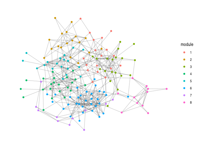 And we can compute common statistics from igraph as well. Here we confirm that clustering by “edge betweeness” gives us the expected number of modules: