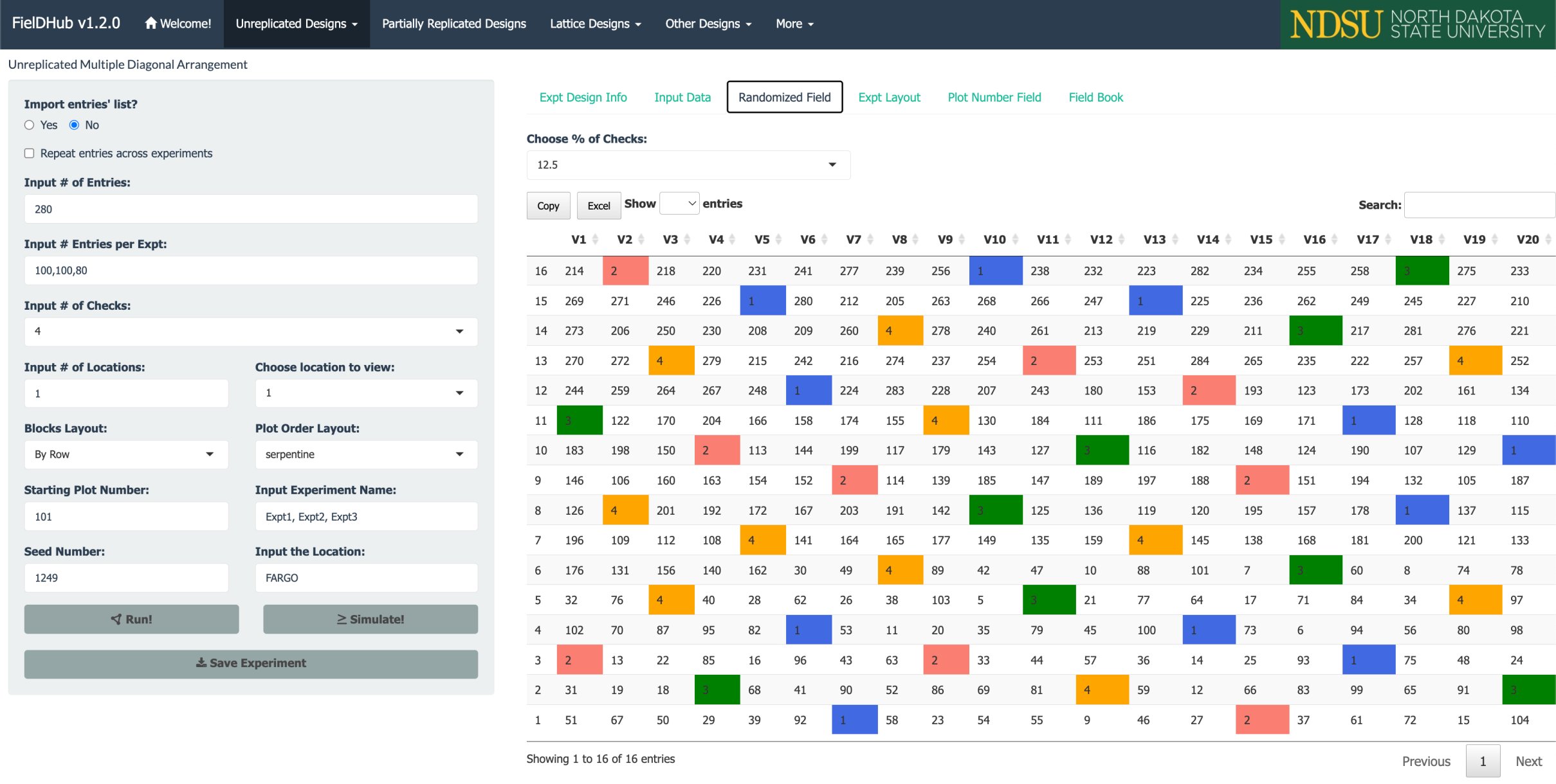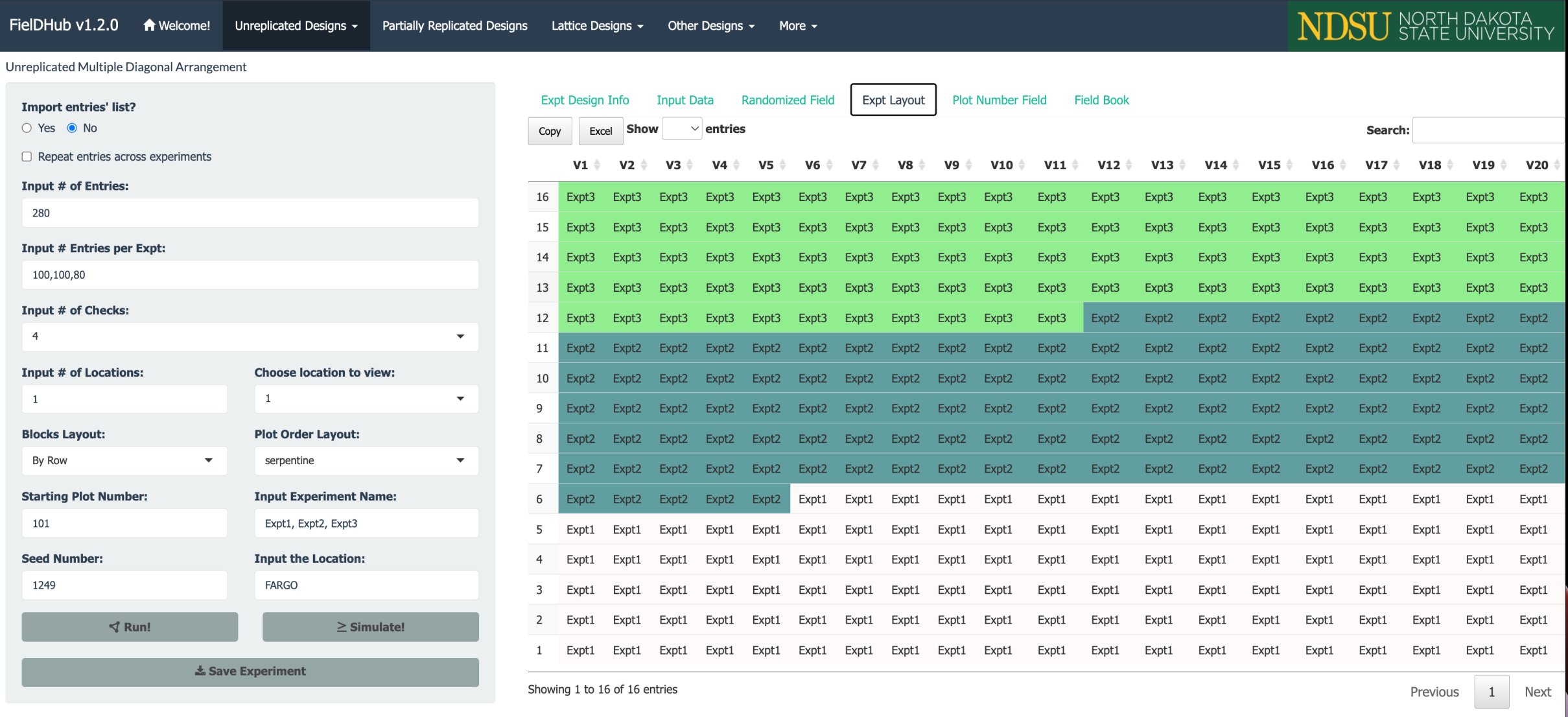 A project needs to test 280 genotypes in a field containing 16 rows and 20 columns of plots. In this example, these 280 genotypes are divided among three different experiments. In addition, four checks are included in a systematic diagonal arrangement across experiments to fill 40 plots representing 12.5% of the total number of experimental plots. An option to include filler plots is also available for fields where the number of experimental plots does not equal the number of available field plots.