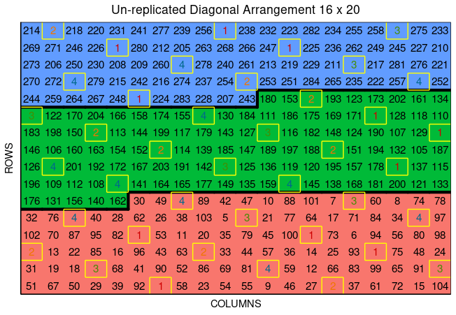 The figure above shows a map of an experiment randomized along with multiple experiments (three) and checks on diagonals. Distinctively colored check plots are replicated throughout the field in a systematic diagonal arrangement.