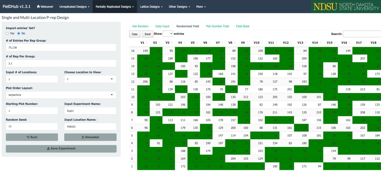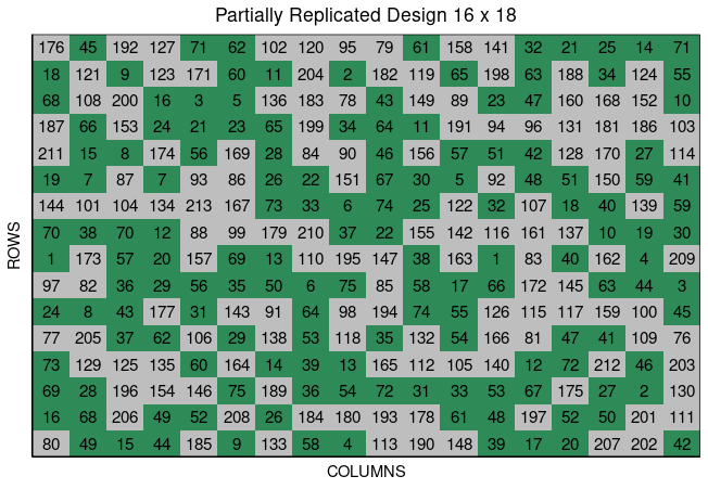 Partially replicated designs are commonly employed in early generation field trials. This type of design is characterized by replication of a portion of the entries, with the remaining entries only appearing once in the experiment. As an example, considered a field trial with 288 plots containing 75 entries appearing two times each, and 138 entries only appearing once. This field trials is arranged in a field of 16 rows by 18 columns.