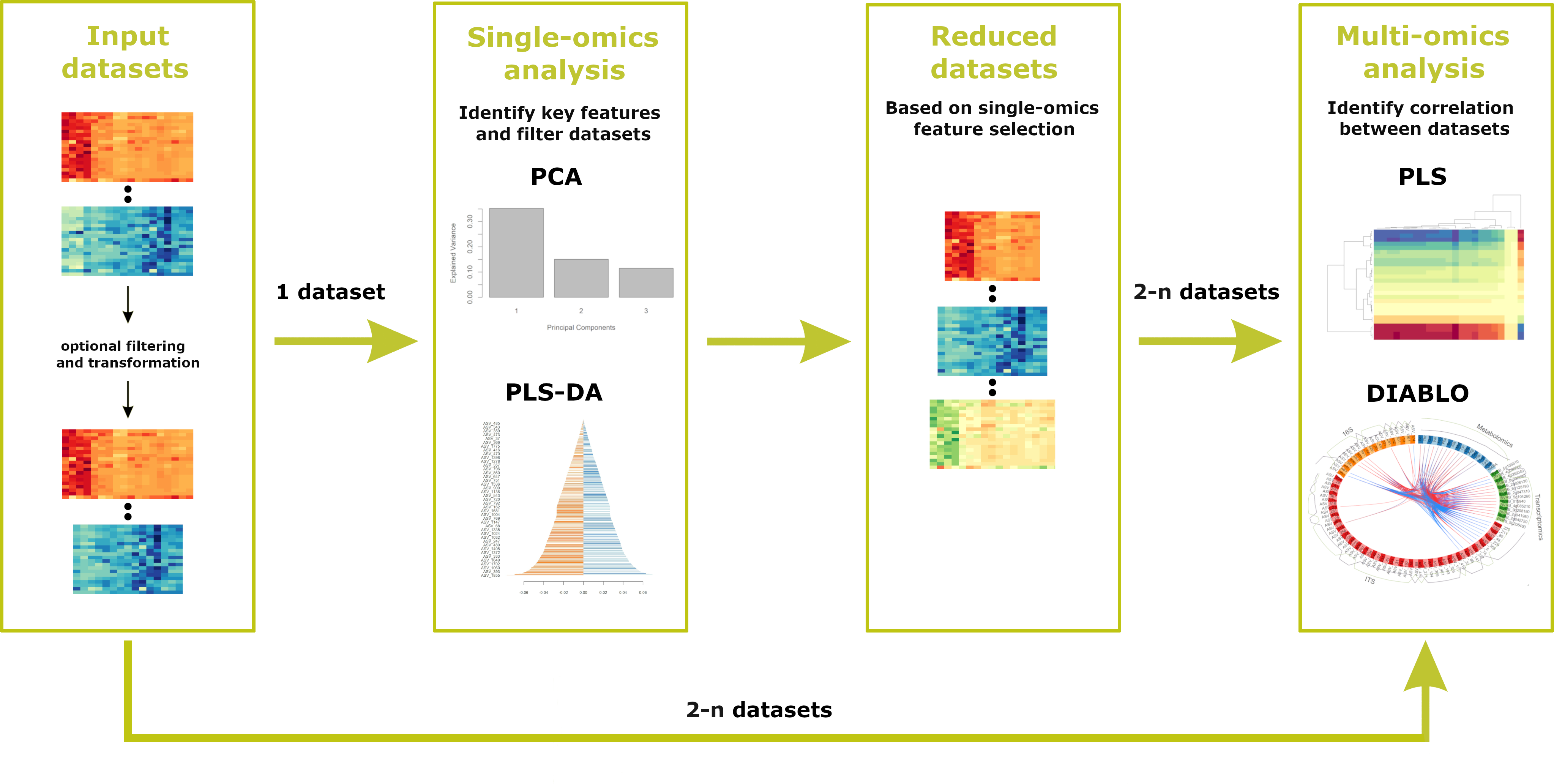 Holomics is mainly built on the R package mixOmics, which offers numerous algorithms for the integrative analysis of omics datasets. From this repertoire, the single-omics algorithms “Principle Component Analysis” (PCA) and “Partial Least Squares Discriminant Analysis” (PLS-DA), the pairwise-omics analysis “sparse Partial Least Squares” (sPLS) and the multi-omics framework DIABLO (“Data Integration Analysis for Biomarker discovery using Latent variable approaches for Omics studies”) have been implemented in Holomics.
