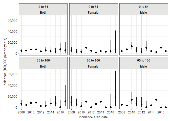 Now we have identified our denominator population, we can calculate incidence and prevalence as below. Note, in our example cdm reference we already have an outcome cohort defined.