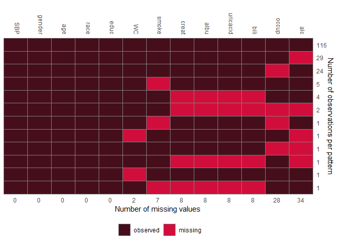 md_pattern(NHANES, color = c('#460E1B', '#D10E3B'))