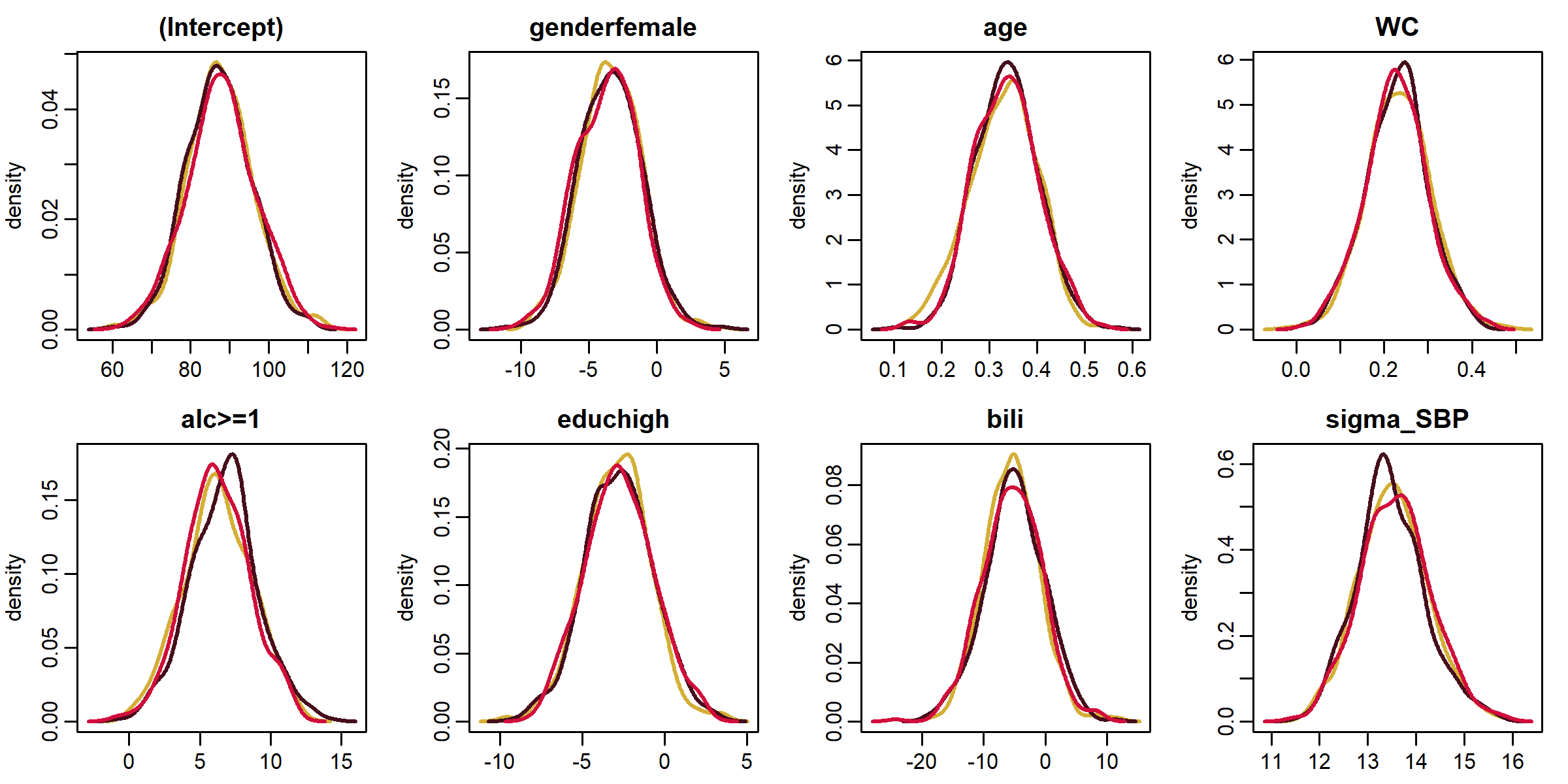 densplot(lm1, col = c('#d4af37', '#460E1B', '#D10E3B'), ncol = 4, lwd = 2)