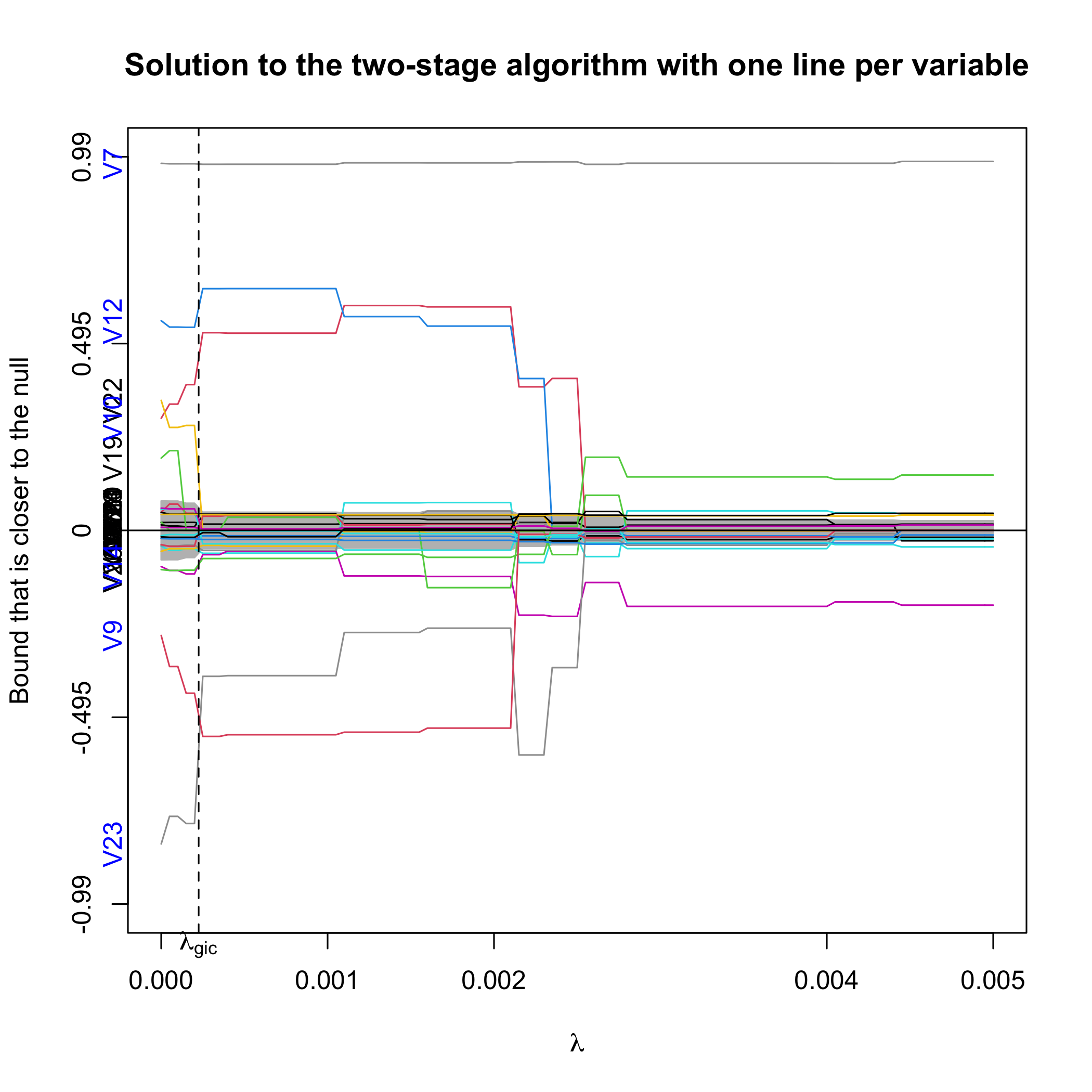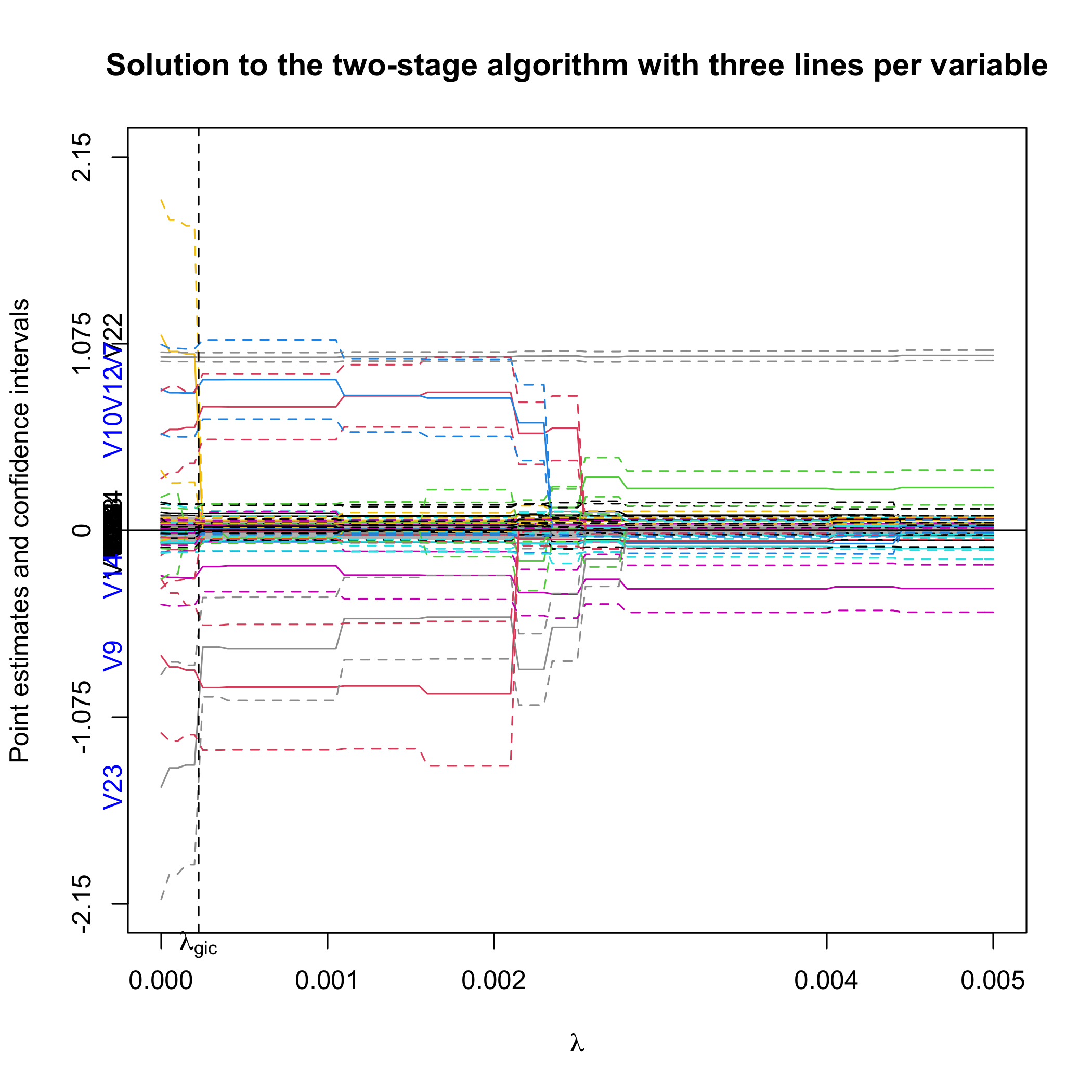 First, we plot the full solution path with point estimates and 95% confidence intervals. Note that the null region is in grey. The selected variables are colored blue on the y-axis. lambda.max controls the limit of the X-axis.