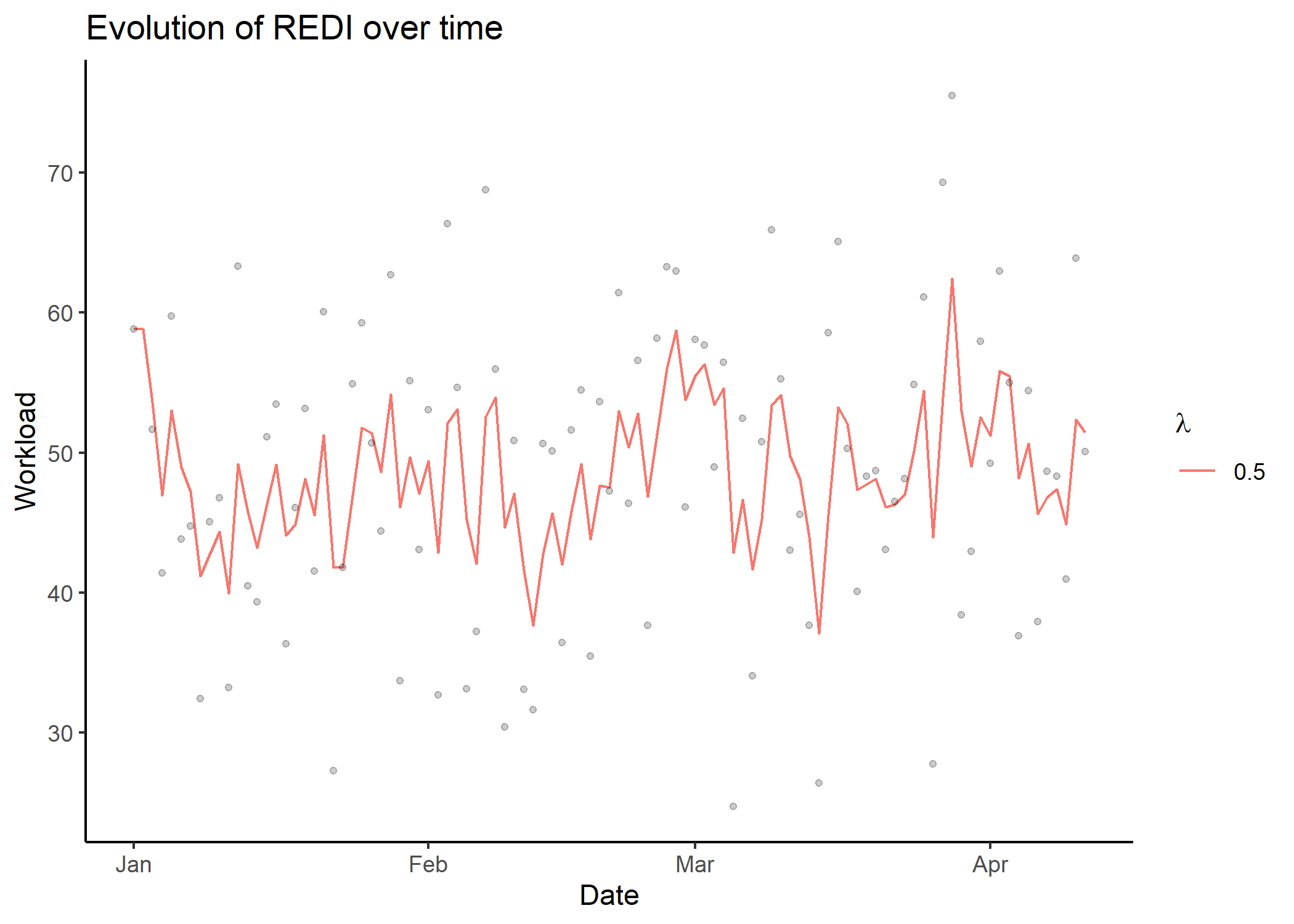 However, a real-life dataset will generally not have the correct format to compute REDI directy. Therefore, the format_data() function is designed to help with this process by identifying the columns corresponding to the Input (e.g the date) and the Output (e.g. the workload) variables. The Input column should be defined with a correct Date type. The function will automatically identify missing values between each observations, considering the by argument as the time increment (for instance with ‘day’, the default, each day between two observed dates is considered missing). Finally, Output values for duplicated Input values can be summarised according to the summarise_duplicate argument.