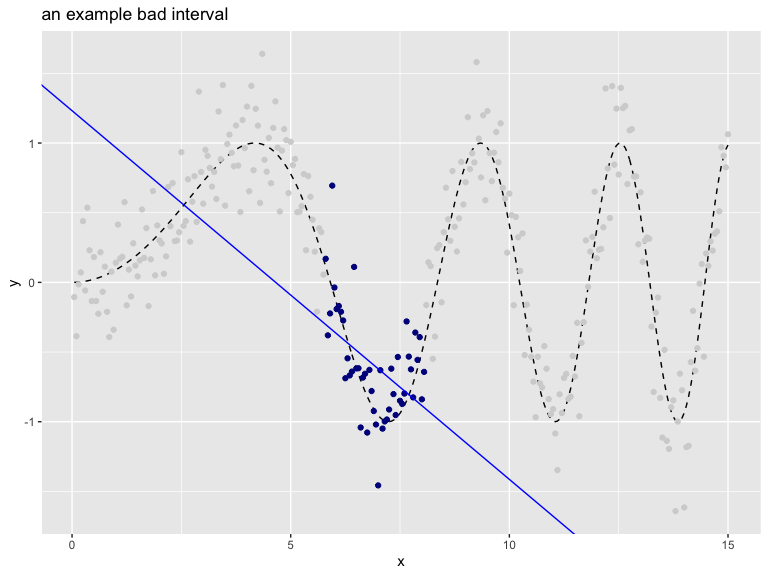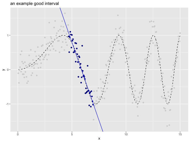 The following interval is a bad interval, as all the chosen points (shown in dark blue) are not in a nearly linear arrangement.