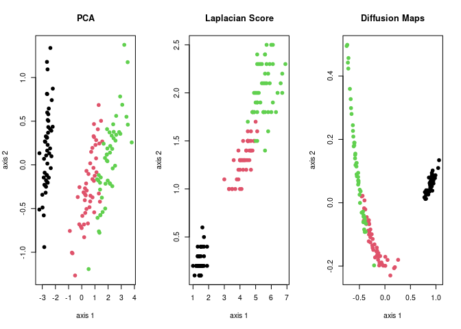 plot(mydfm$Y, pch=19, col=lab, xlab="axis 1", ylab="axis 2", main="Diffusion Maps")