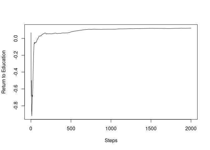 plot(mincer_sgd_path$path_coefficients[1:2000], ylab="Return to Education", xlab="Steps", type="l")