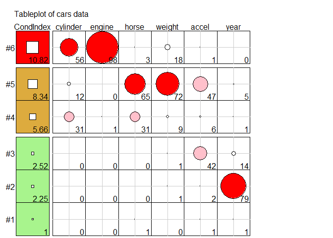 The simplified tabular display above can be improved to make the patterns of collinearity more visually apparent and to signify warnings directly to the eyes. A “tableplot” (Kwan et-al., 2009) is a semi-graphic display that presents numerical information in a table using shapes proportional to the value in a cell and other visual attributes (shape type, color fill, and so forth) to encode other information.