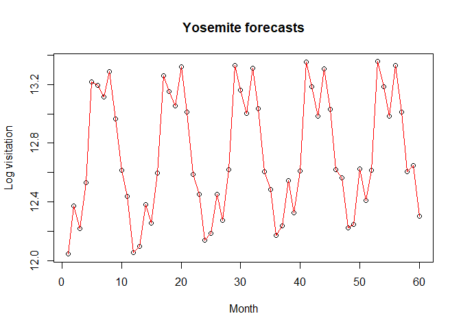 <- predict(yose_visitation_model, n_ahead = 60)$forecast[1:60] yosemite_visitation_forecasts
