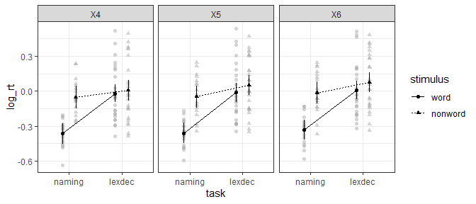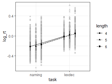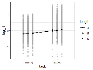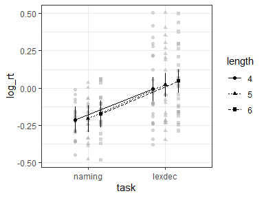 #> Model: log_rt ~ task * length + (1 | id) + (task || item)