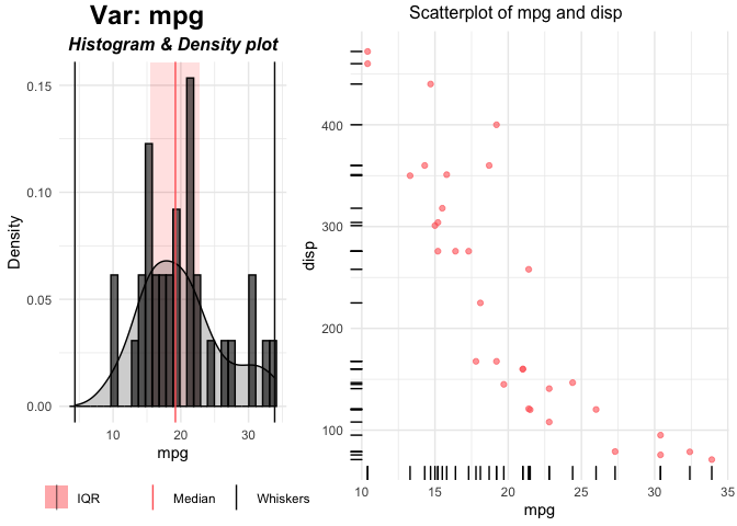 The left plot is the univariate plot of ‘mpg’. Right plot is bivariate plot with the dependent variable ‘disp’.