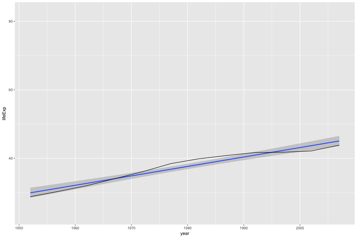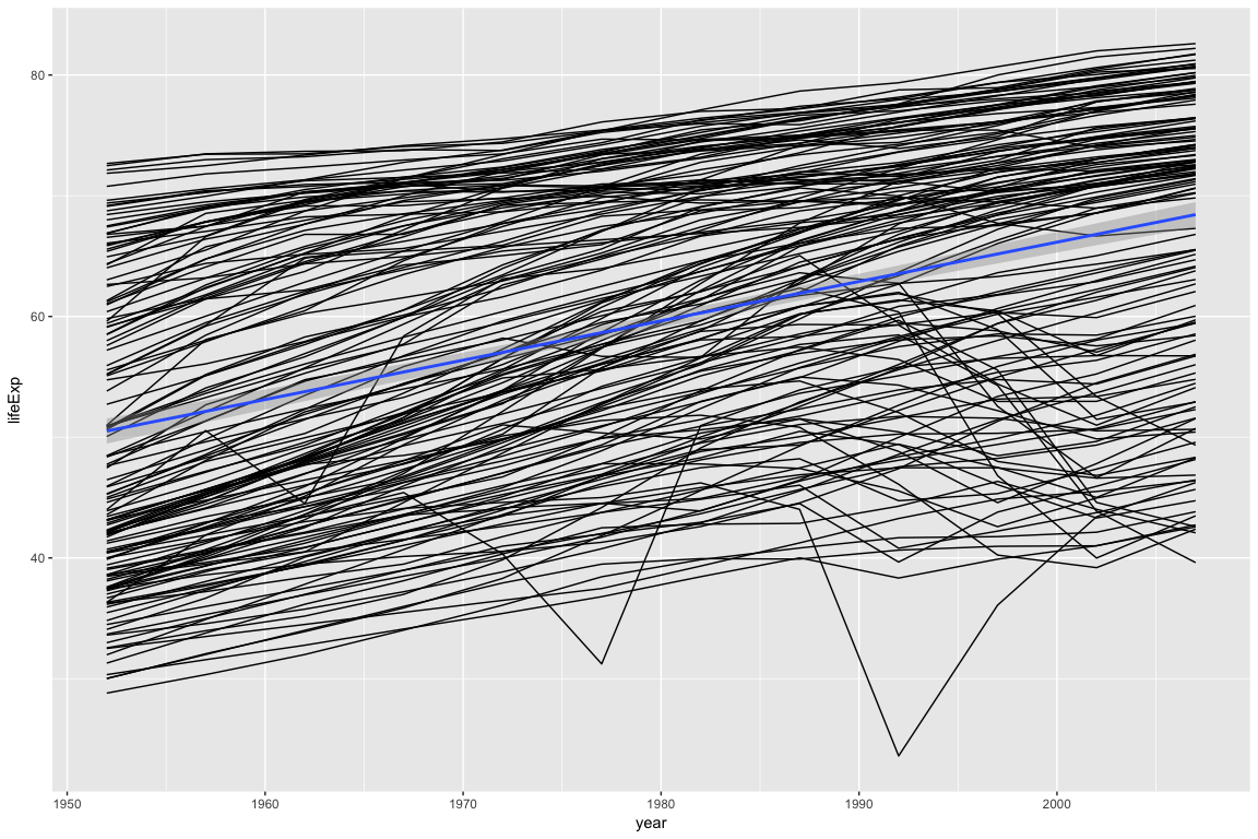 p ggplot(gapminder, aes(year, lifeExp)) +