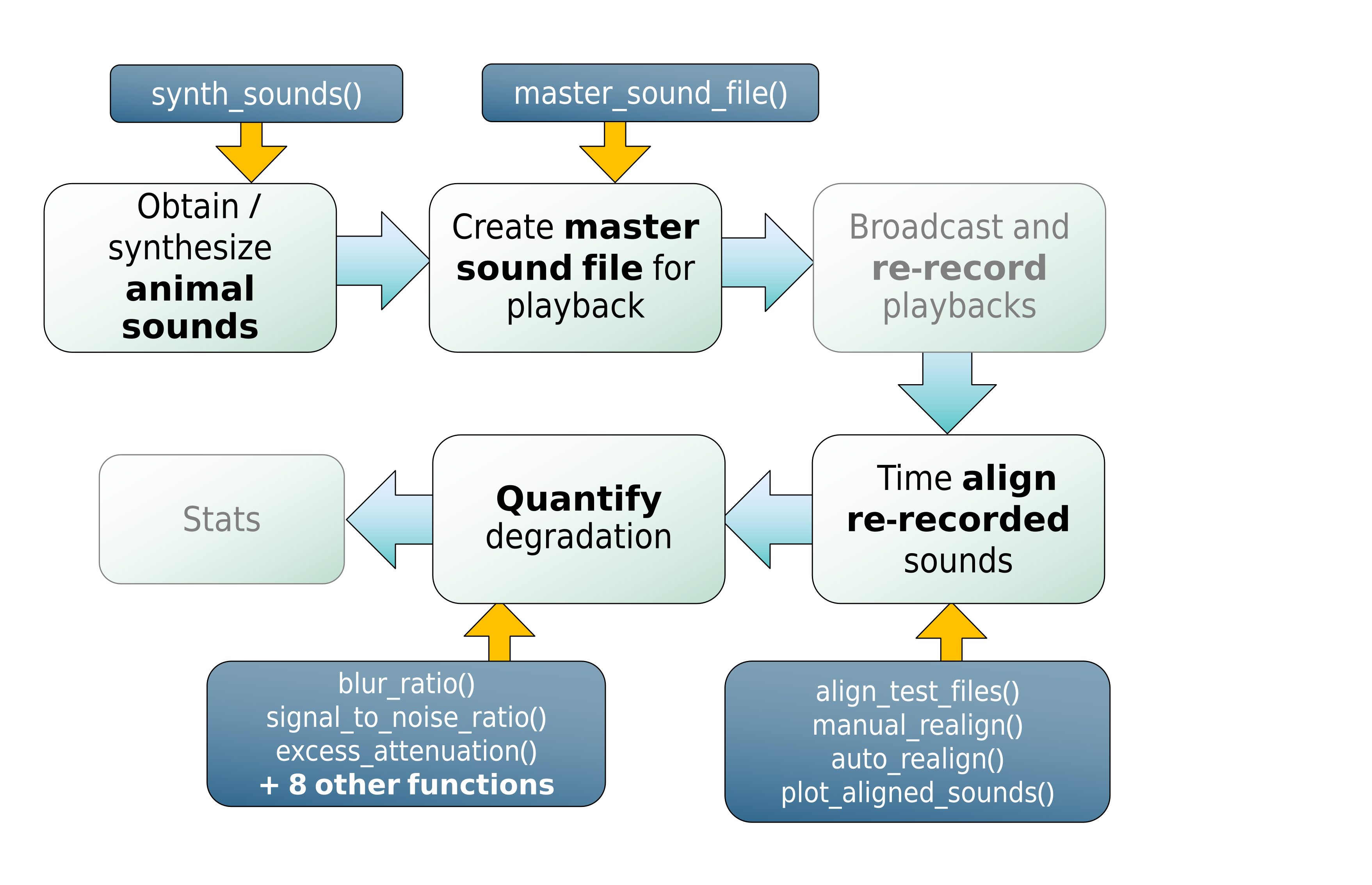 Diagram depicting a typical workflow for a experiment working on signal propagation and degradation. Nodes with black font indicate steps that can be conducted using baRulho functions. Blue nodes denote the functions that can be used at those steps.