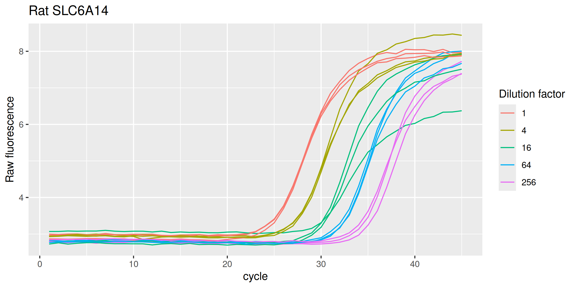labs(y = "Raw fluorescence", colour = "Dilution factor", title = "Rat SLC6A14") +