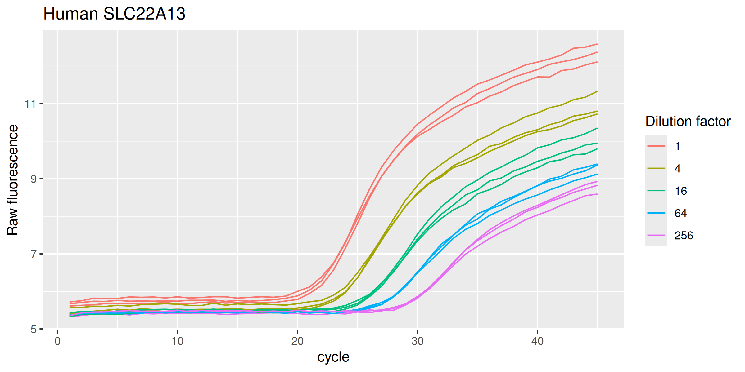 labs(y = "Raw fluorescence", colour = "Dilution factor", title = "Human SLC22A13") +