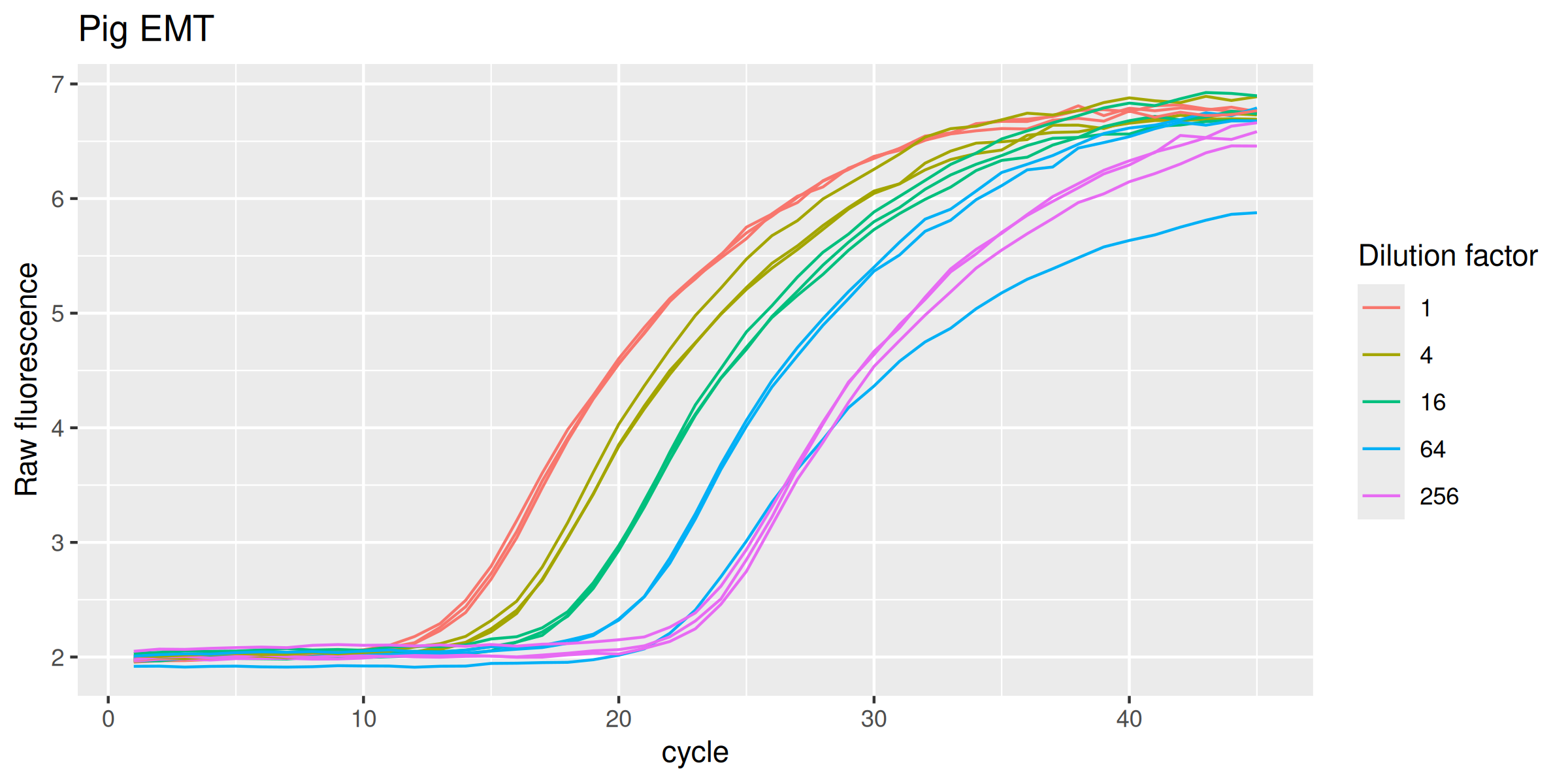 labs(y = "Raw fluorescence", colour = "Dilution factor", title = "Pig EMT") +