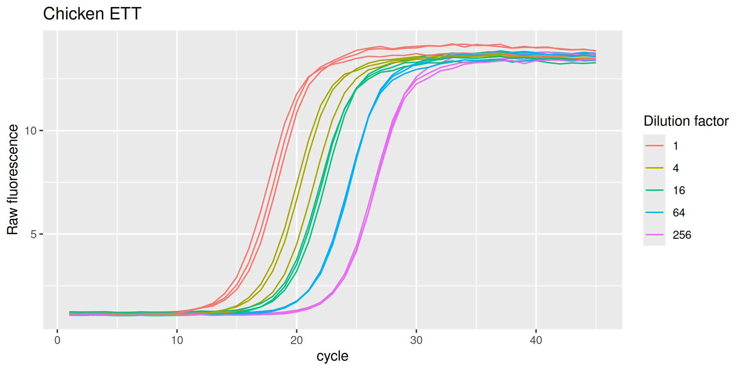 labs(y = "Raw fluorescence", colour = "Dilution factor", title = "Chicken ETT") +