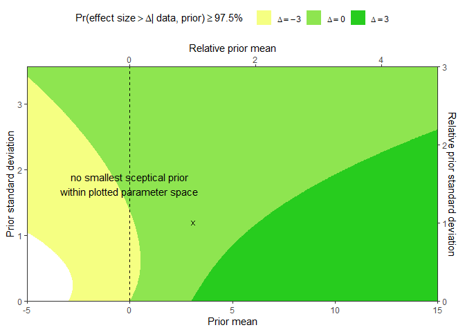 The resulting RoE plot enables to evaluate the presence of the respective claim (colored areas) or their absence (white area) as a function of prior expected mean (x-axis) and prior standard deviation (y-axis) that could be used by an assessor. The cross marks the effect estimate that was used to construct the RoE. The dashed vertical line represents all the sceptical priors that assume the true effect around 0, with a varying degree of uncertainty.