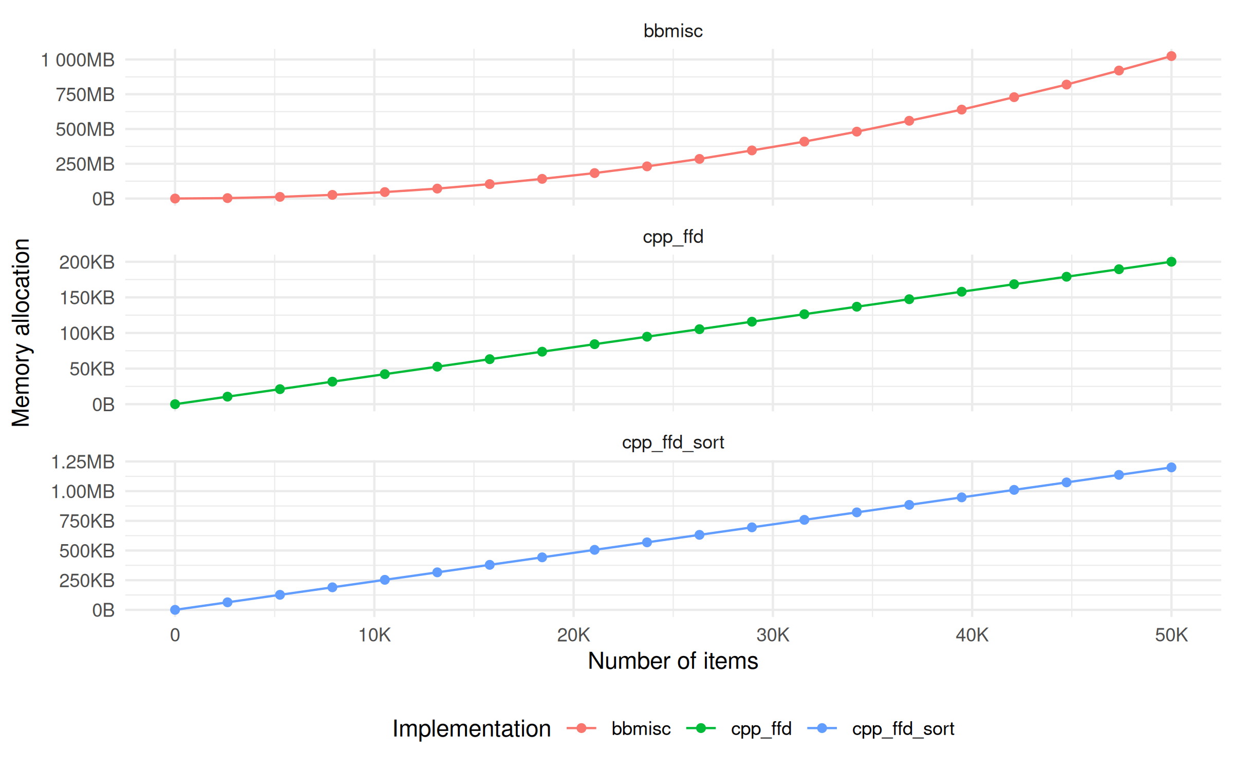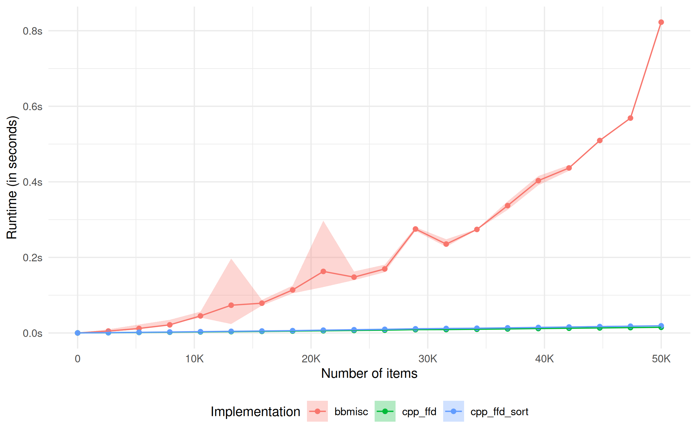 The implementation in this package is compared to an implementation of the same algorithm in the BBmisc package. The authors made it clear that speed was none of their concern. BBmisc’s implementation is written in R while this package uses a C++ implementation.
