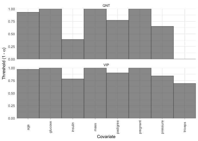 We can compare the selected variables using the VIP method to the QNT method, which selects all variables that have a 95% bootstrap confidence interval that does not contain 0: