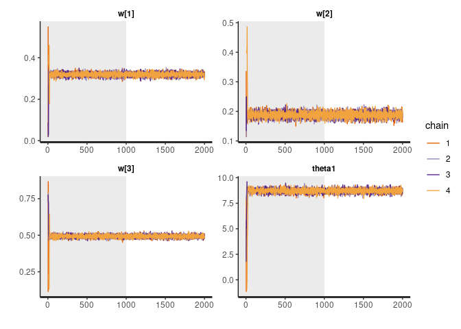 ::traceplot(fit, pars = c("w", "theta1"), inc_warmup = TRUE, nrow = 2) rstan
