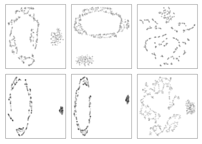 tSNE (t-distributed Stochastic Neighbor Embedding) and UMAP (Uniform Manifold Approximation and Projection) representations of mobius_clust_data