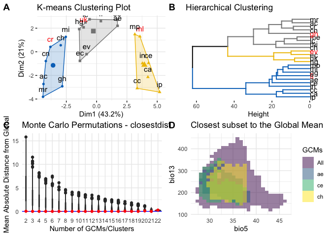 As an alternative for experienced modelers that want to deeply understand the impacts of decisions on GCMs selection, we prepared a set of functions to analyze data more carefully. Each function in the wrapper mentioned above is available to be explored as stand-alone, ranging from exploratory analysis to cluster analysis and methods to determine the optimum number of clusters.