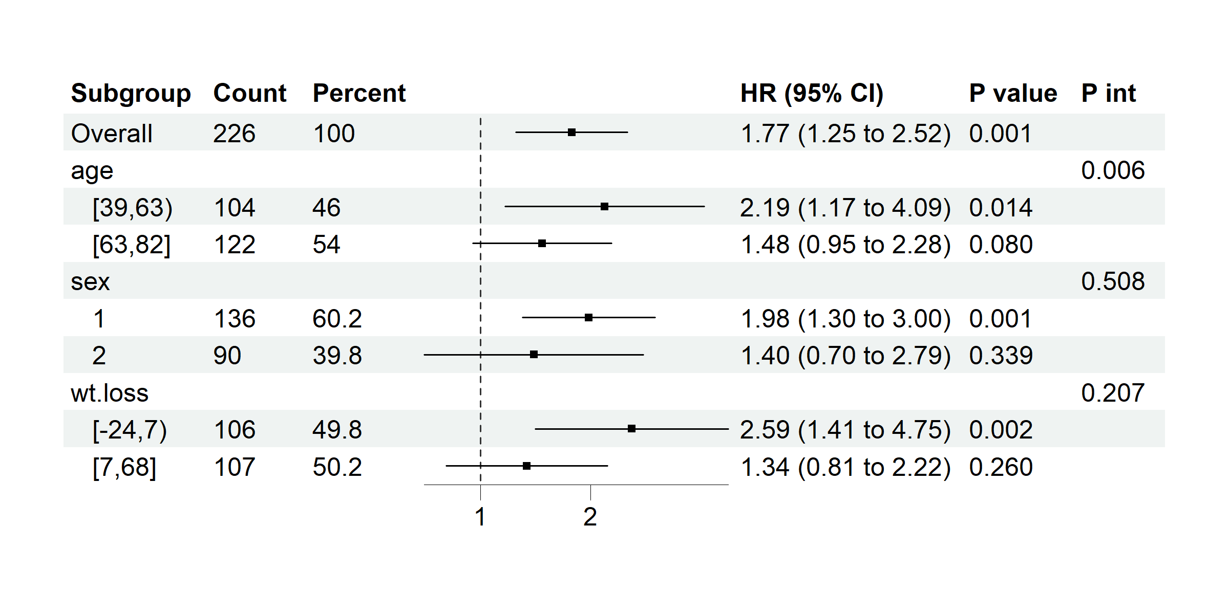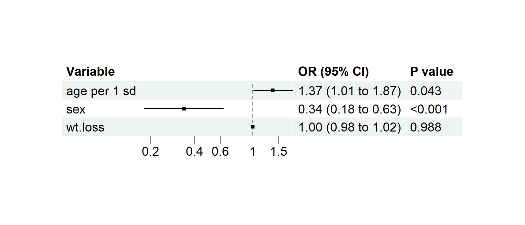p1 model_vars = c("age per 1 sd", "sex", "wt.loss"), y = "dead",