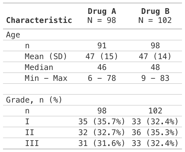 tbl tbl_demographics(by = trt, include = c(age, grade)) |>