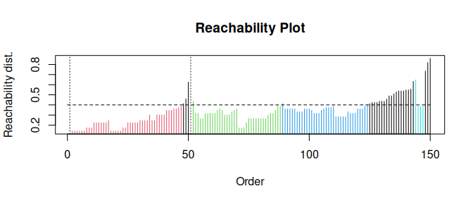 <- extractDBSCAN(opt, eps_cl = 0.4)