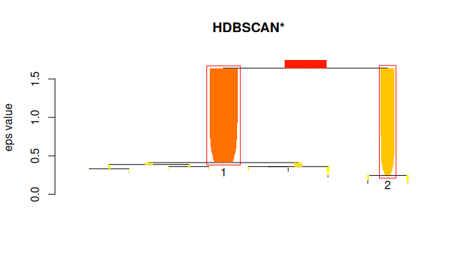 Visualize the hierarchical clustering as a simplified tree. HDBSCAN finds 2 stable clusters.