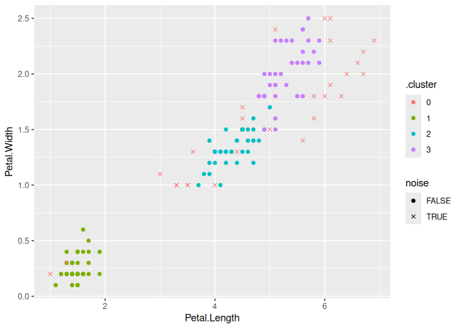 Visualize the clustering with ggplot2 (use an x for noise points)