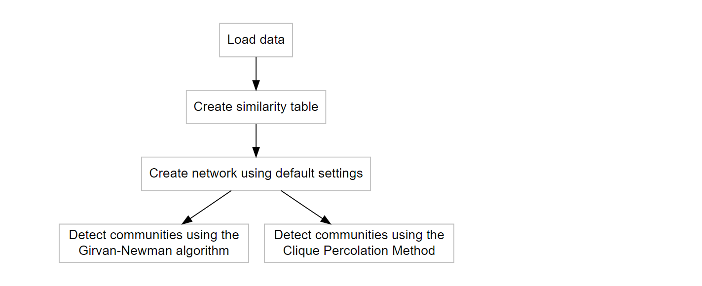 The first steps are visualized in the flowchart below, including community detection using either (or both) the Girvan-Newman algorithm (Girvan and Newman 2002) and Clique Percolation Method (Palla et al. 2005) for all clique sizes. Both methods are explained very well in the papers, and on wikipedia for both CPM and the Girvan-Newman algorithm.