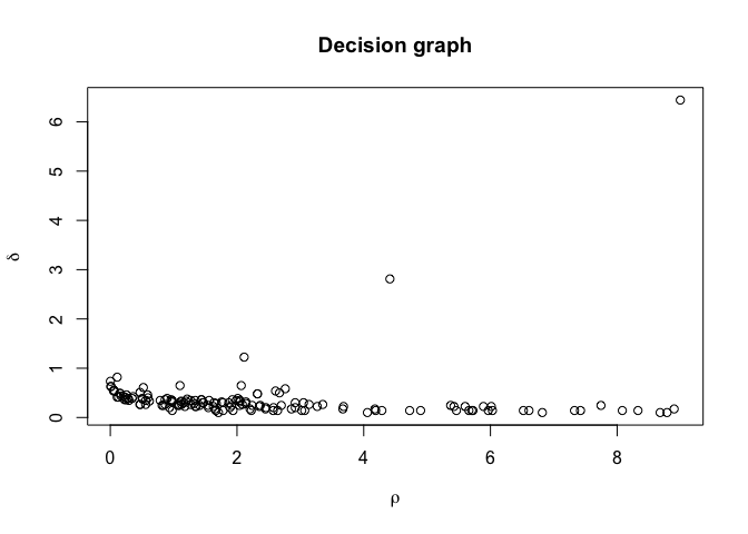 and make cluster assignment for each observation based on a user defined rho and delta threshold. If the thresholds are not specified the user is able to supply them interactively by clicking on a decision plot.