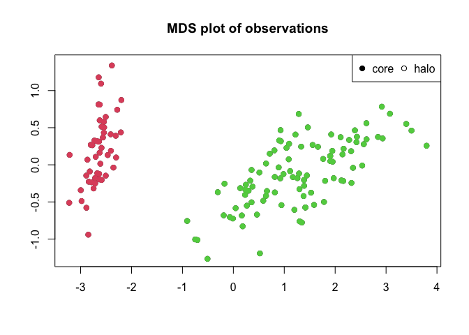 performs a multidimensional scaling of the distance matrix and plots this as a scatterplot. If clusters are assigned observations are coloured according to their assignment.