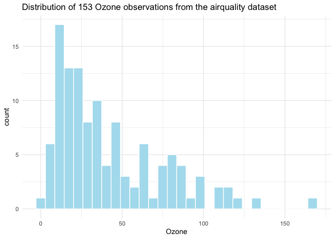 labs(title = "Distribution of 153 Ozone observations from the airquality dataset")