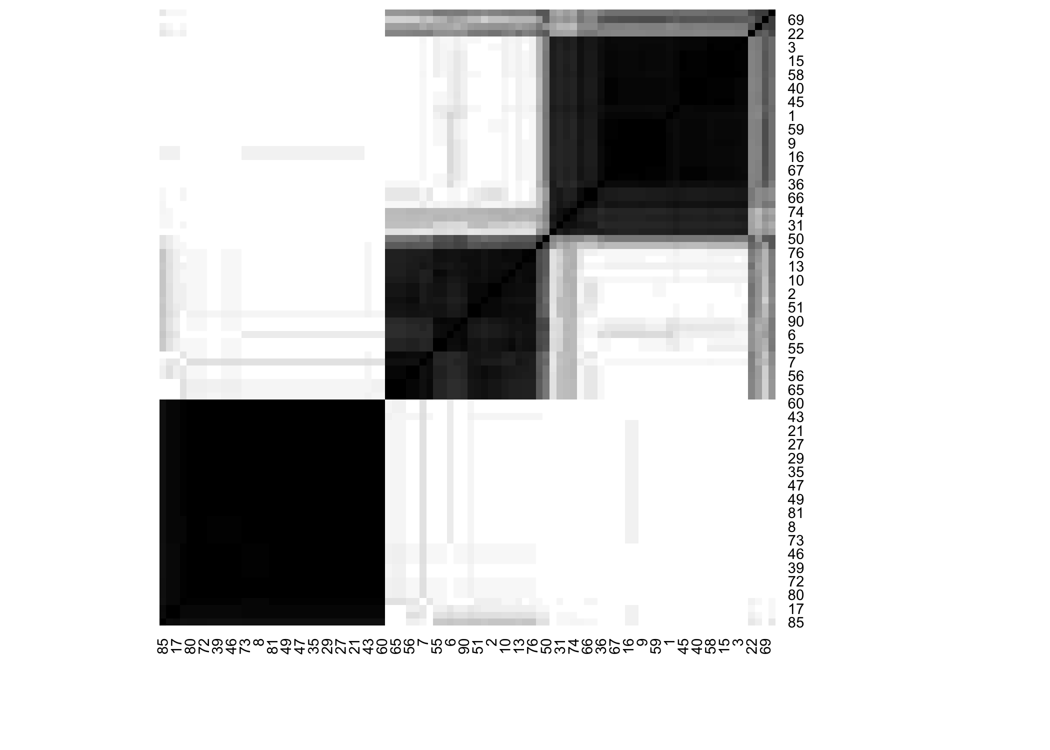 To evaluate how well our tree captures the structure of the RF and replicates its classification, we introduce a procedure to measure the goodness of explainability. We start by visualizing the final partition generated by the RF through a heatmap — a graphical representation of the co-occurrence matrix, which reflects how often pairs of observations are grouped together across the ensemble. Each cell shows a pairwise similarity: the darker the cell, the closer to 1 the similarity — meaning the two observations were frequently assigned to the same leaf. Comparing these two matrices — both visually and statistically — allows us to assess how well E2Tree reproduces the ensemble structure. To formally test this alignment, we use the Mantel test, a statistical method that quantifies the correlation between the two matrices. The Mantel test is a non-parametric method used to assess the correlation between two distance or similarity matrices. It is particularly useful when we are interested to study the relationships between dissimilarity structures. The test uses permutation to generate a null distribution, comparing the observed statistic against values obtained under random reordering.