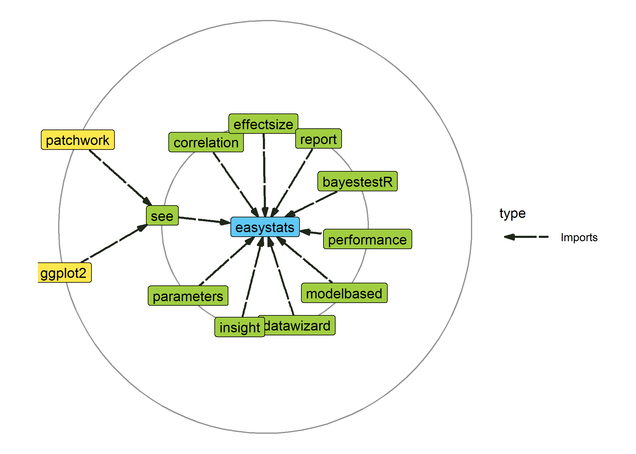 plot_dependencies("easystats", depth = 2L, show_stamp = FALSE)