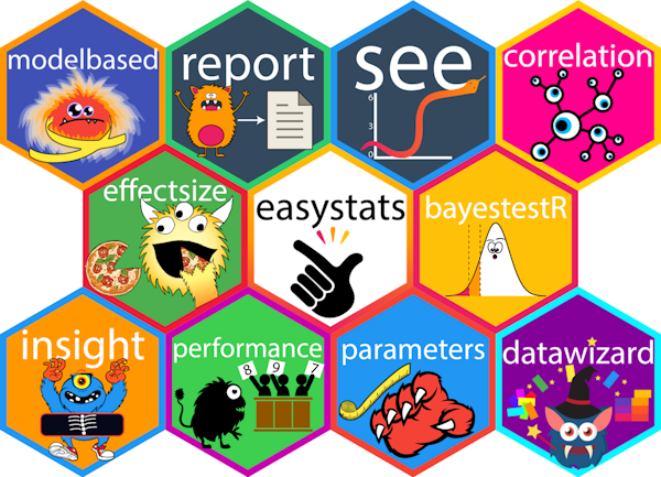 easystats is a collection of R packages, which aims to provide a unifying and consistent framework to tame, discipline, and harness the scary R statistics and their pesky models.