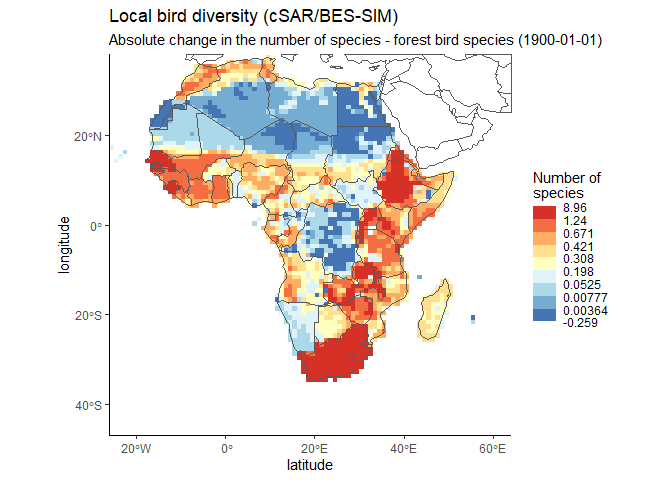 #> [1] "Changes in bird diversity at 1-degree resolution caused by land use, estimated by the cSAR model for 1900-2015 using LUH2.0 historical reconstruction of land-use."
