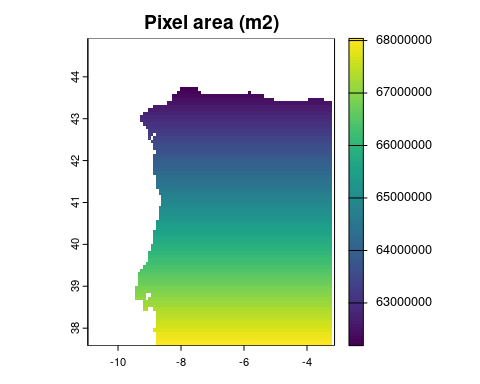 These variable raster layers have a given pixel size in geographic degrees, with a nominal pixel size at the Equator, but (as the longitude meridians all converge towards the poles) actual pixel sizes can vary widely across latitudes. So, let’s check the average pixel size in our study region, as well as the spatial uncertainty values of our occurrence coordinates: