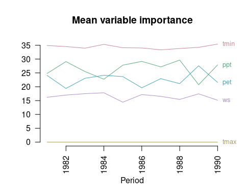 Note that the output plot does not reflect the deviations around the mean importance of each variable each year (see this value in the output table); and that the plot may become too crowded if there are many variables or if their importances overlap. Note also that “variable importance” is a vague concept which can be measured in several different ways, with potentially varying results!