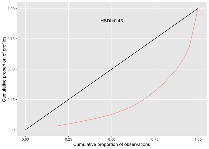 The Health State Density Curve (HSDC) was introduced by Zamora et al in 2018 and provides a graphical way to depict the distribution of EQ-5D profiles. The cumulative frequency of health profiles ranked from most to least frequent is plotted against the cumulative proportion of the distinct health profiles (red line) and can be compared a uniform distribution representing total equality (black line). The Health State Density Index (HSDI) is based on the area formed by the diagonal line representing total equality and the line of the HSDC. The HSDI has a value between 0 and 1 where a value of 0 represents total inequality and 1 total equality.
